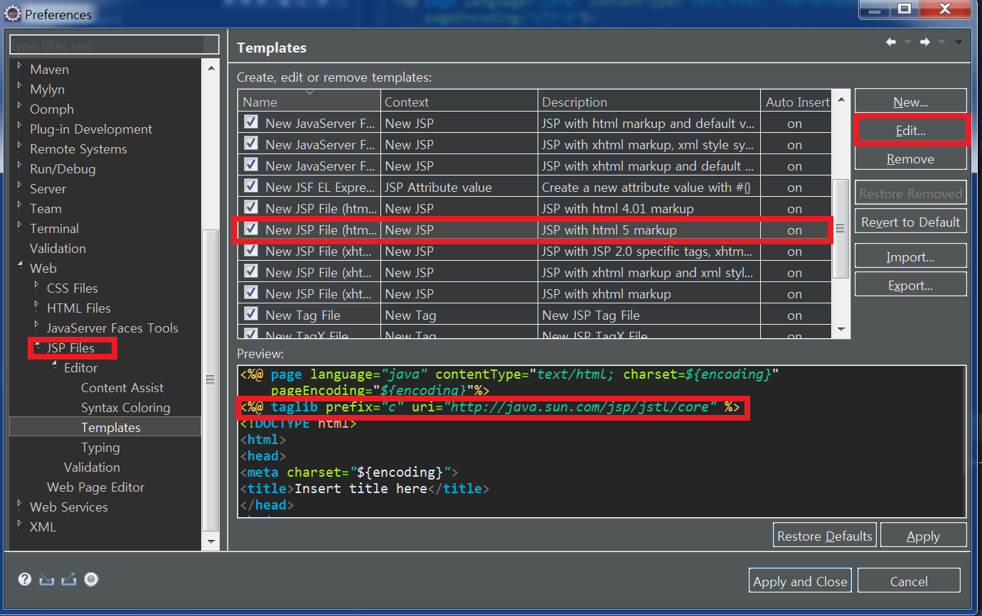 taglib이 자동으로 선언되도록 편집할 수가 있습니다.