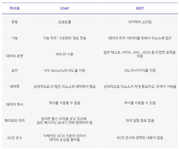 그 자체로 프로토콜이며 보안이나 메세지 전송에 있어 REST보다 많은 표준들이 정해져있기 때문에 조금 복잡합니다.