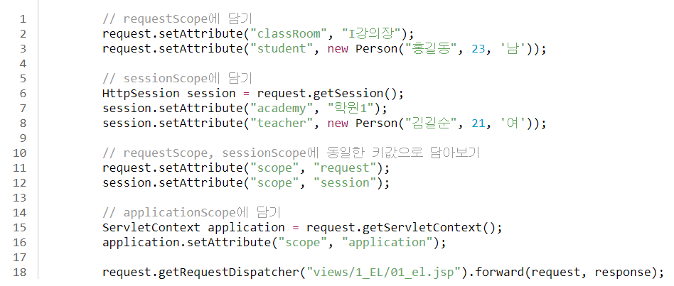 - EL은 request, session 등 JSP 내장객체를 구분하지 않아도 알아서 영역들에 키값(속성명)을 검색해서 존재하는 경우 해당 밸류값을 가져옵니다.