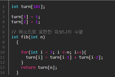 아래는 피보나치 수열을 이용한 N번째 수를 구하는 함수이다.
