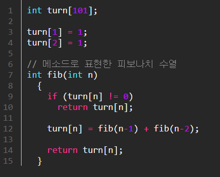 - 위에서 아래로 접근하는 방법, 재귀 호출 (피보나치 수 구하는 방식)