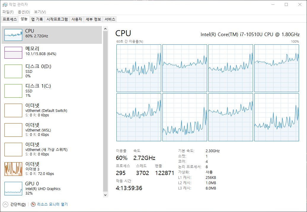 c#으로 작성한 프로그램에서는 cpu사용량이 평균적으로 60~70이 나왔고