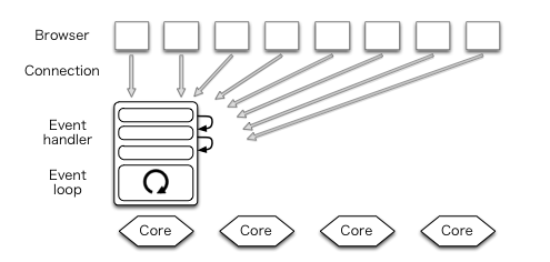 반면에, Nginx는 Event handler를 통해 동작하기 때문에 한개 또는 고정된 프로세스만 진행 후, 비동기방식으로 요청들을 처리할 수 있다. 위의 그림에서 보이듯이 Nginx는 새로운 요청이 들어오더라도 새로운 프로세스와 쓰레드를 생성하지 않기 때문에 프로세스와 쓰레드 생성 비용이 존재하지 않고, 적은 자원으로도 효율적인 운용이 가능하다. 이러한 Nginx의 장점 덕분에 단일 서버에서도 동시에 많은 연결을 처리할 수 있다.