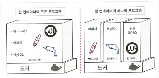 - 도커를 사용할 때 '한 컨테이너에 한 프로그램'이라는 원칙이 있다. 보안과 유지 관리 측면에서 유리하기 때문이다.