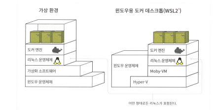 - 도커는 '리눅스' 운영체제에서만 동작할 수 있으므로, Windows, MacOS에서는 Hypervisor를 설치하여 VM으로 리눅스 운영체제를 생헝하여 설치하는 등 도커를 실행하는데 필요한 리눅스 운영체제가 꼭 필요하다. (아래 그림 참조)